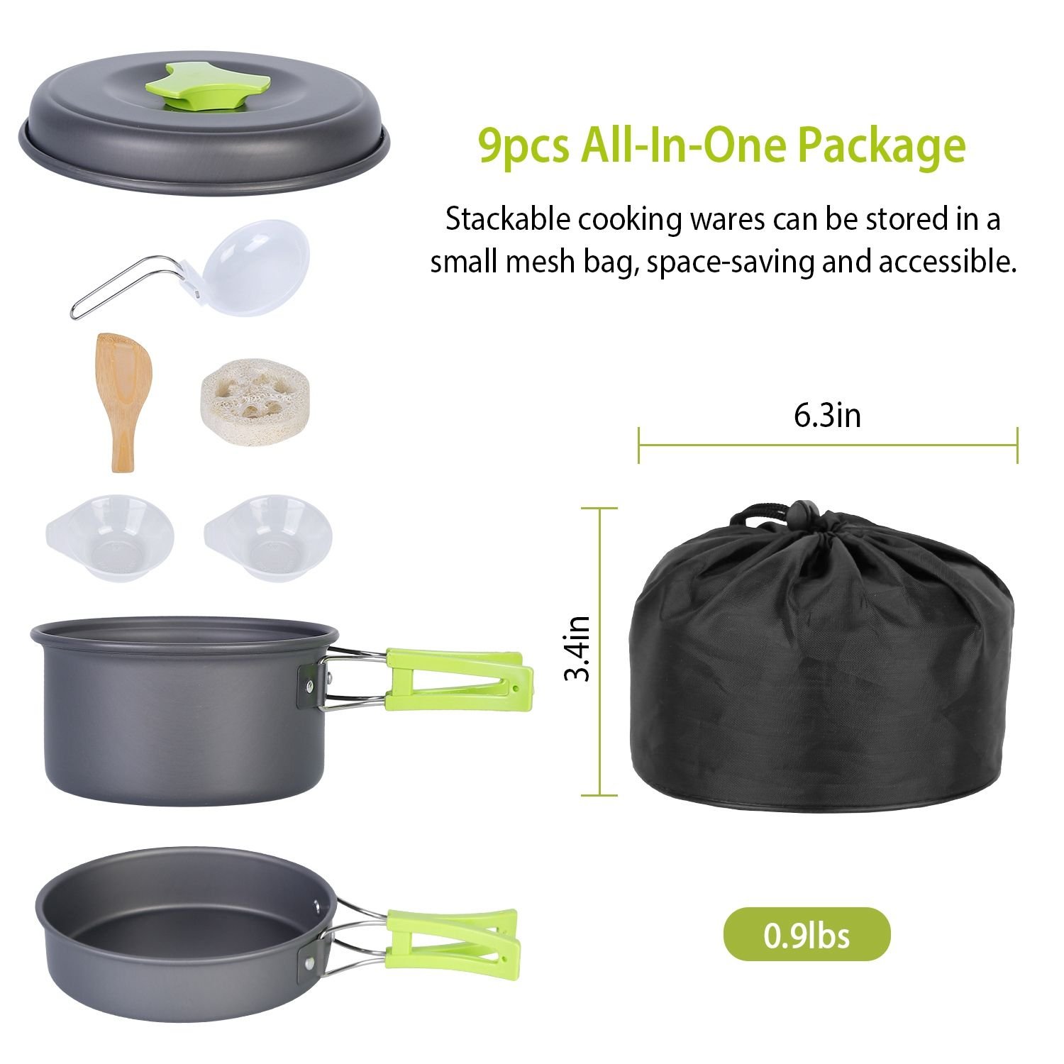 *9Pcs Outdoor Cooking Set*:This package contains 1 pot(1.3L); 1 pan(0.7L); 1 lid; 2 bowls; 1 spoon; 1 spatula; 1 cleaning tool; and 1 storage bag. You can find everything you need for outdoor cooking in this small package.