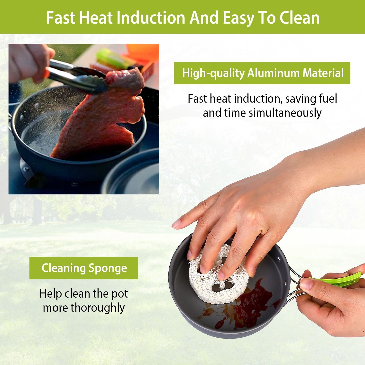 *Safe & Efficient*:The pot and pan are made of anodized aluminum; which is lightweight and fast in heat conduction. It’s easier to clean; transport and carry; money and time saving. Besides; the foldable handles at the side are heat-resistant and skid-proof; which can effectively avoid burning hands. Made of food-grade plastic; the spoon and bowls are safe and durable.