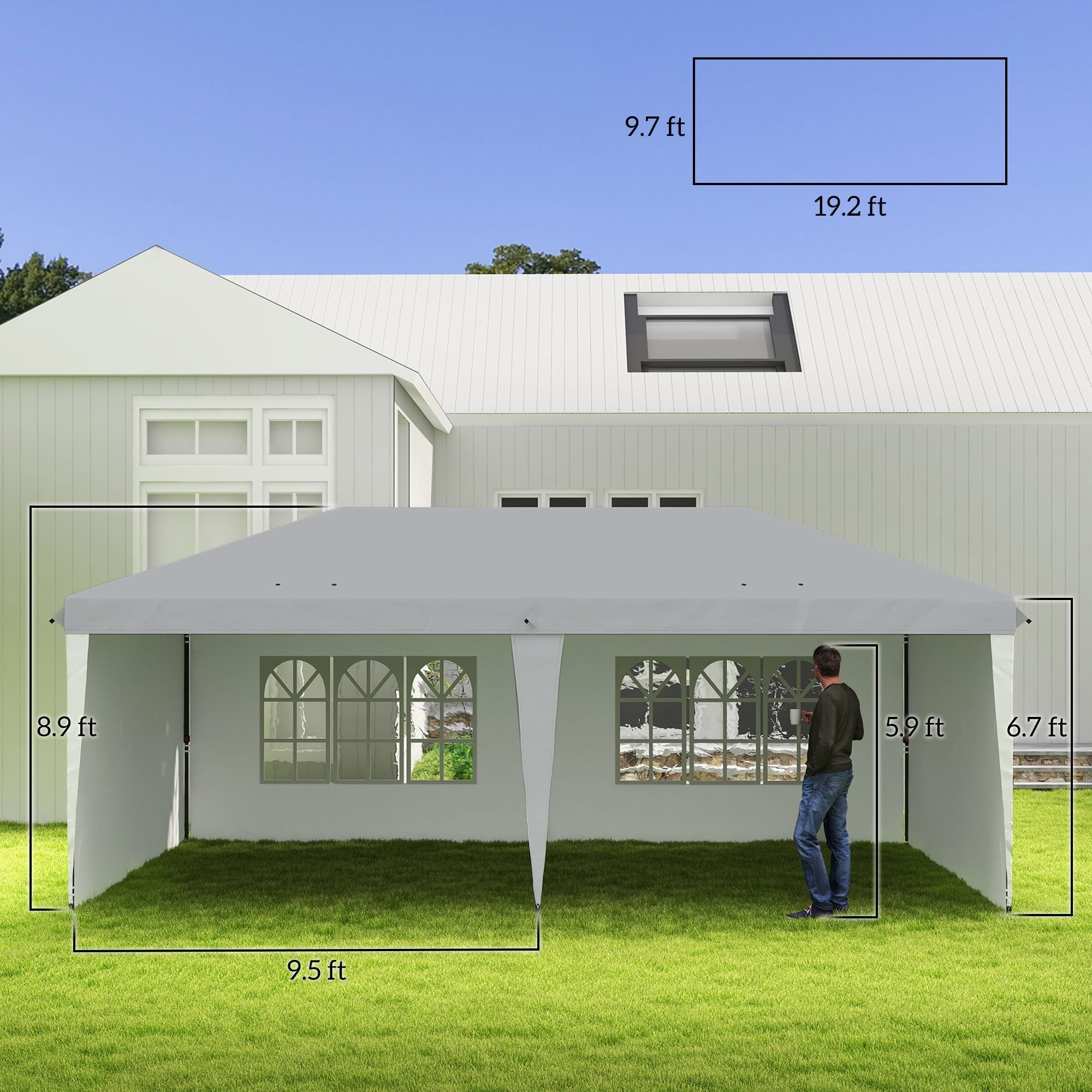 Pop in, pop up, and pop out. Outsunny's large easy up canopy offers superior shade with silver-coated Oxford fabric to block 90% of UV rays. Sidewalls stop wind and create a more secluded area. Windows allow adequate light, and stakes offer support on soft ground. Whether you want to use it for a wedding, barbeque, or outdoor event as a vendors tent, its convenient carrying bag makes travel and storage easy. Get out, get, comfy, get Outsunny.