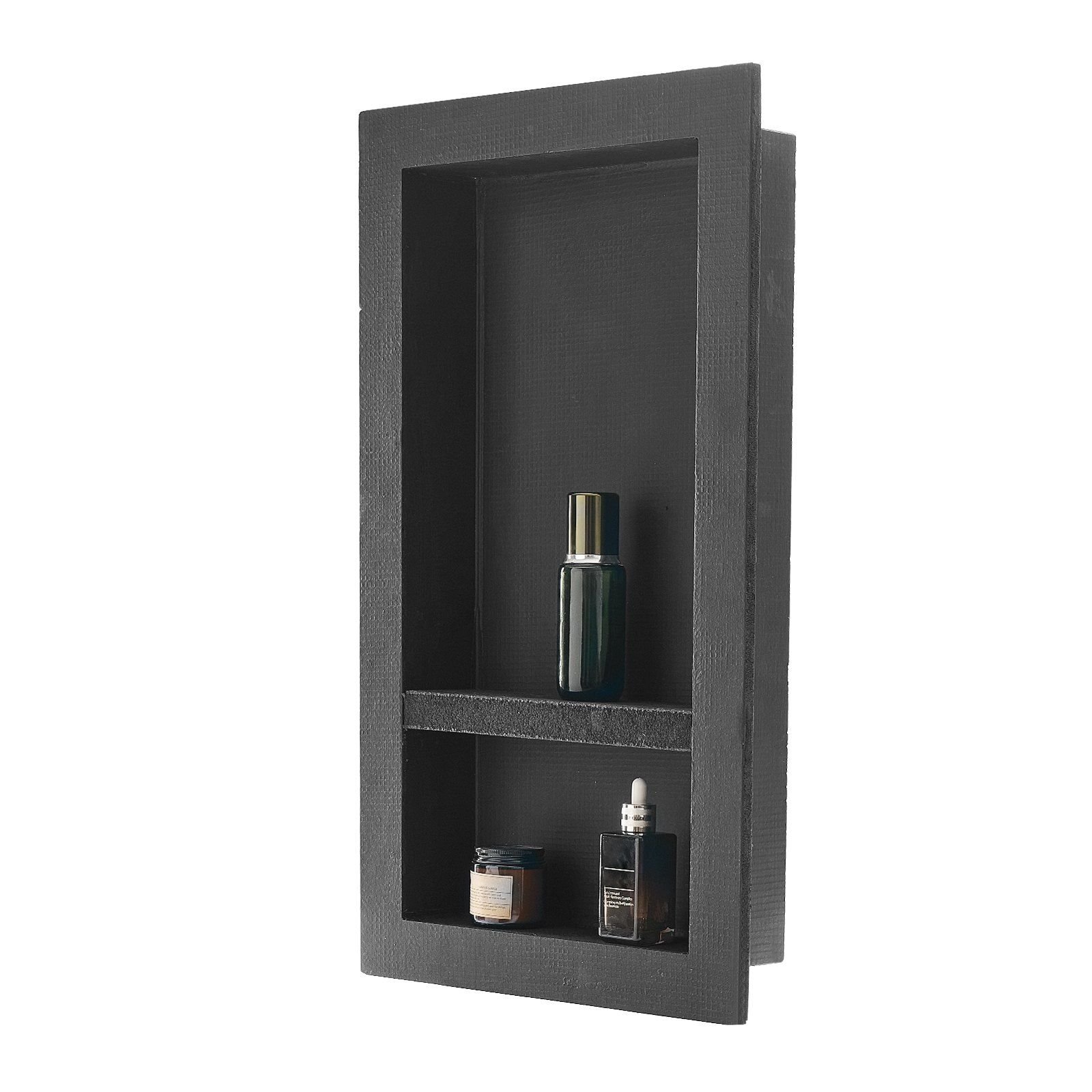 Shower niche, sealed and waterproof with reinforced surface for better load-bearing. The textured grid surface is compatible with any tile adhesive for easy installation. Includes installation kit for horizontal or vertical recessed mounting. Ideal for bathrooms, cabinets, bookshelves, kitchens.