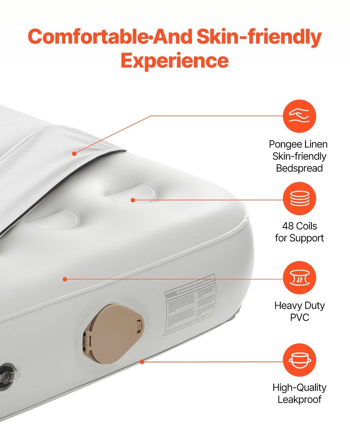 3.Durable & Sturdy: The inflatble air mattress with frame supports up to 660lbs (300kg) and is recommended for use with a weight of ≤600lbs (272kg). Suitable for individuals up to 6ft tall. Made from heavy-duty PVC + spring polyester fabric, it's tear-resistant, durable, and provides stable support.