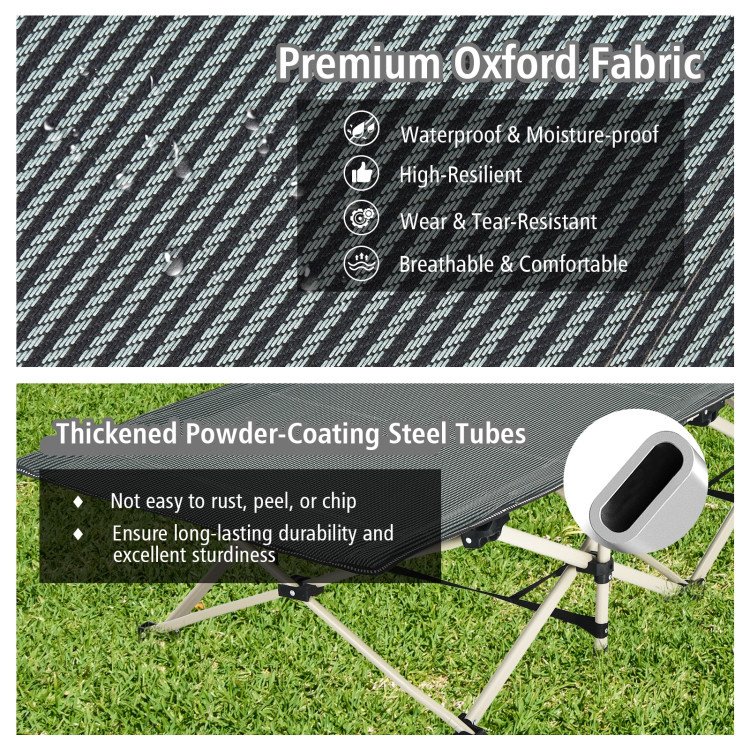 ● Comfy and Sturdy Material: Crafted with premium oxford fabric that is breathable, soft, and waterproof, the sleeping cot delivers a comfortable skin touch helping you get full relaxation while allowing for easy cleaning. Besides, the frame is supported by thickened powder-coated steel tubes for superior strength and excellent rust resistance.